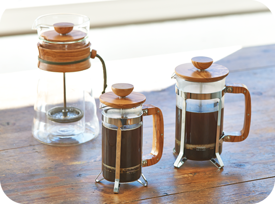 オリーブウッドをあしらったプレス式コーヒーメーカー。贈り物や自分へのご褒美に。