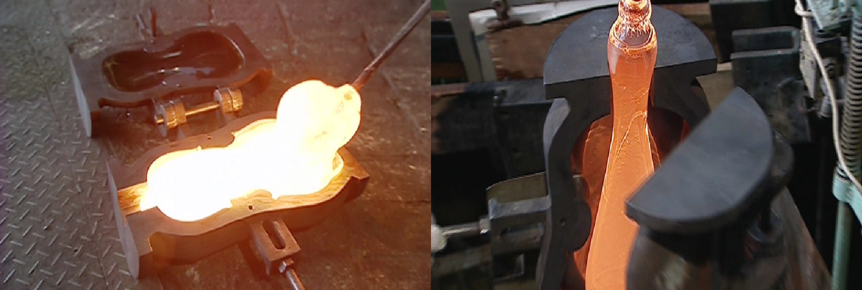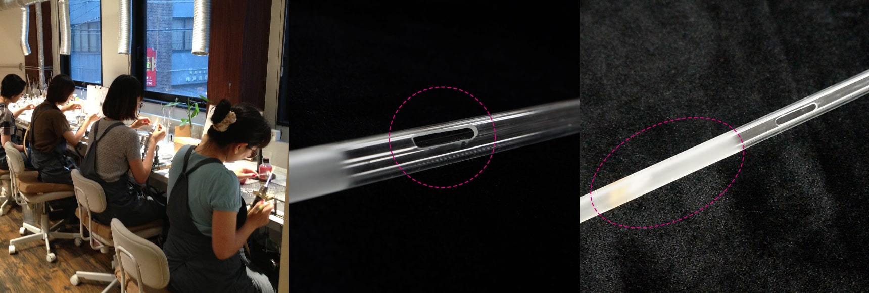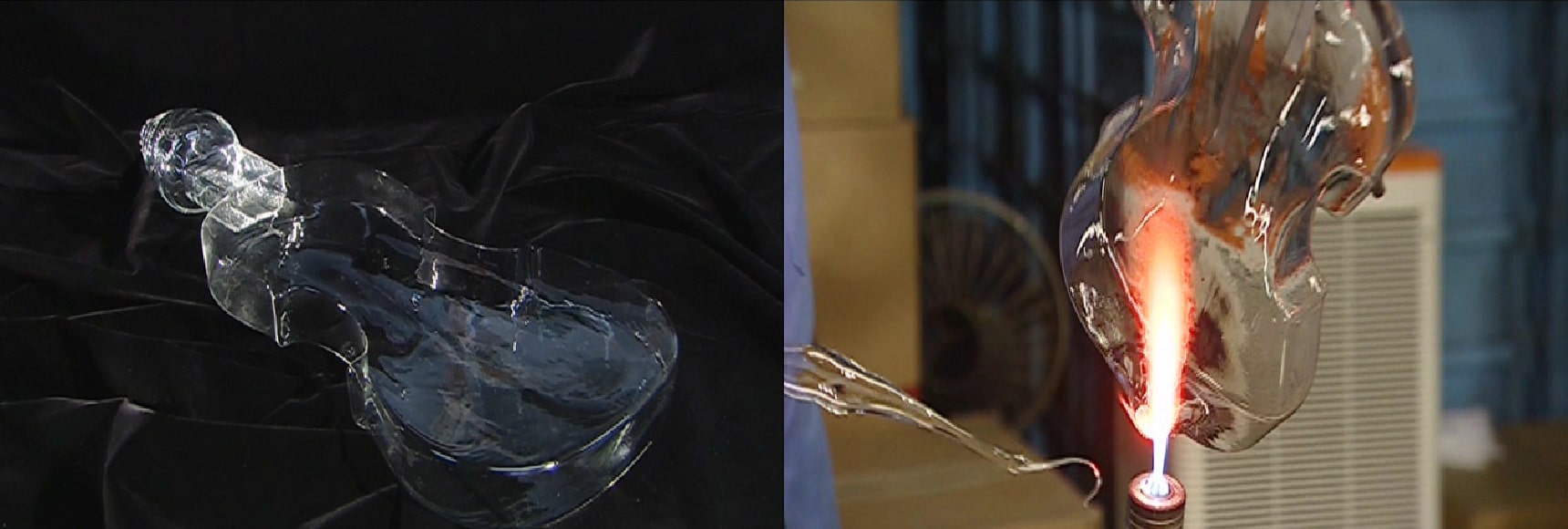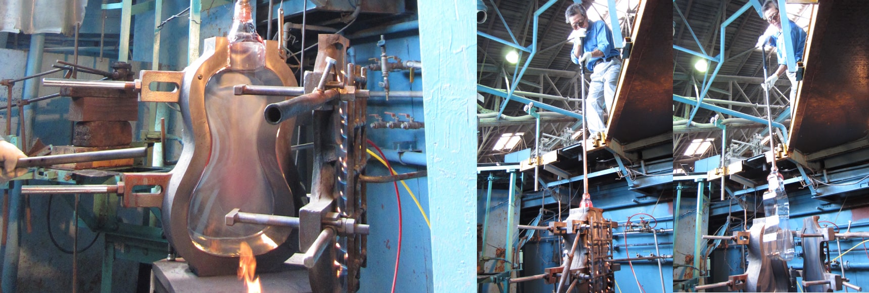 手吹き、かつ停止吹きの技術を持つ熟練の職人が、ステンレス製の吹き竿の先に、窯の中で溶けているガラスを巻き取り徐々に息を吹き込みながら楽器のボディを成形しました。