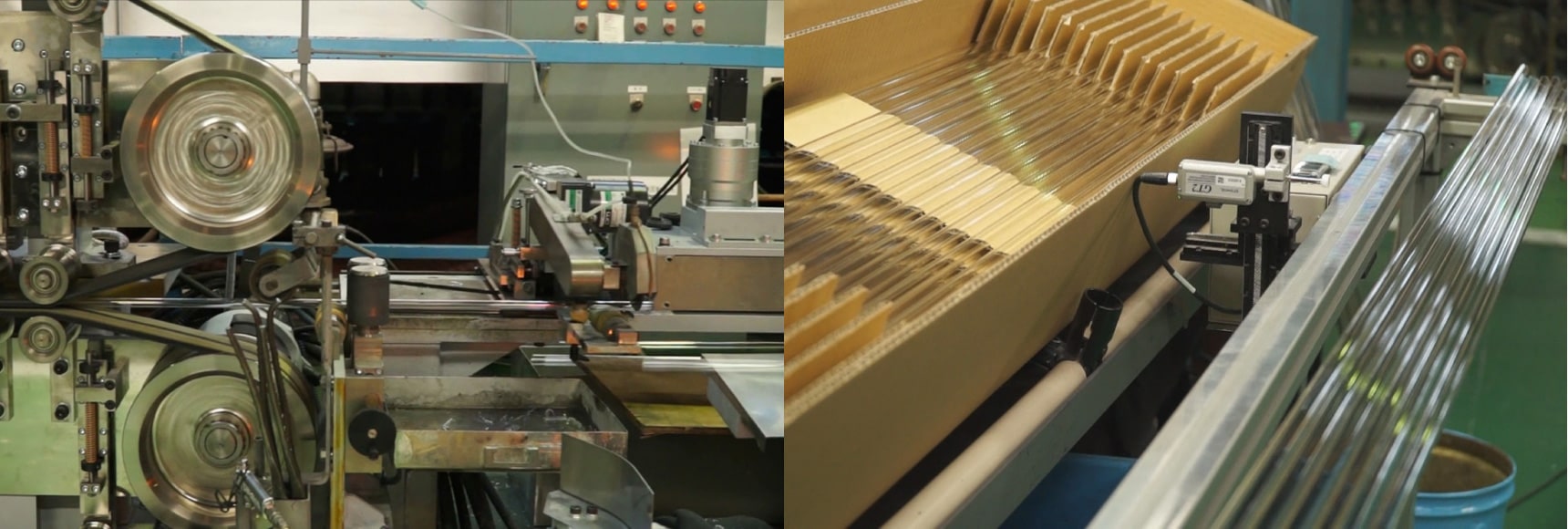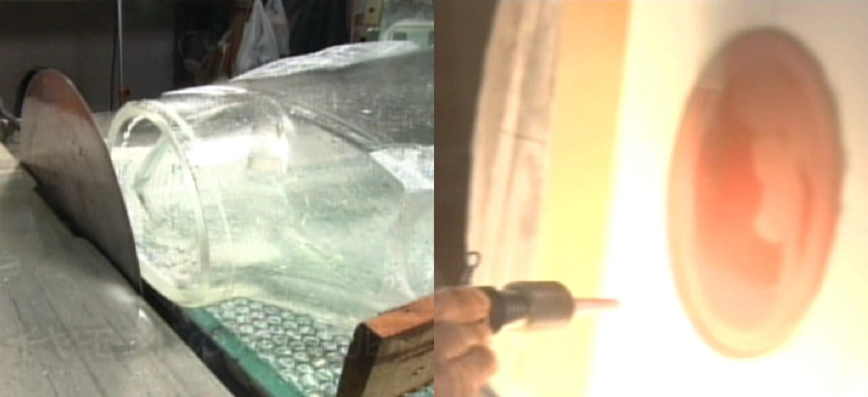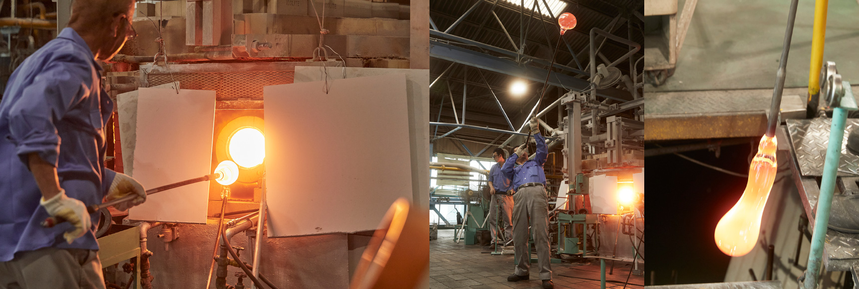 手吹き、かつ停止吹きの技術を持つ熟練の職人が、ステンレス製の吹き竿の先に、窯の中で溶けているガラスを巻き取り徐々に息を吹き込みながら楽器のボディを成形しました。