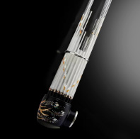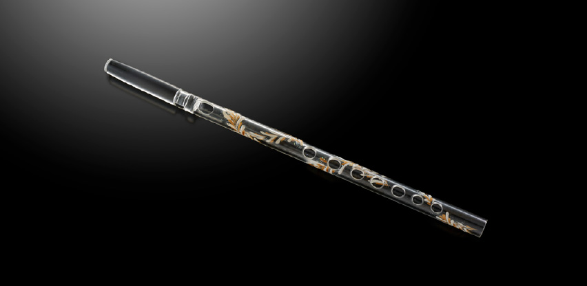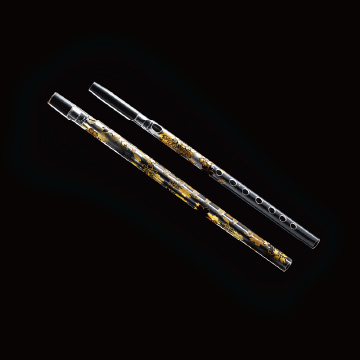 耐熱ガラス製のため木製よりも軽く、かつ温度に左右されず安定した音程を保てるという特性があります。また製作にあたっては、奏者の監修のもと、円筒形の成形をはじめ、指穴の大きさや吹き口の角度を職人による手作業で一つひとつ丹念に加工・調整して、ガラスならではの音に加え、木製の尺八の音の深みを再現する事にこだわりました。- 重量:
