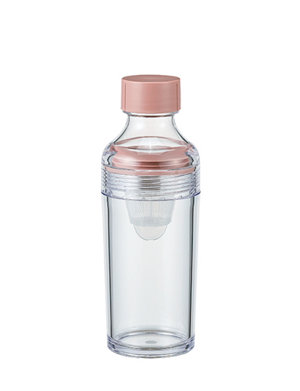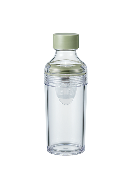 フィルターインボトル・ポータブルは、注ぎ口部分に フィルターメッシュがセットされた、容量160mLの 小さな水出し茶ポット。ボトル本体は、透明性・耐熱 性・衝撃強度のある安心素材のPCT樹脂製。軽くて とても丈夫なので、そのまま小さなバックに入れても 安心。ちょっとそこまで&お散歩のお供にぴったりの サイズ感です。