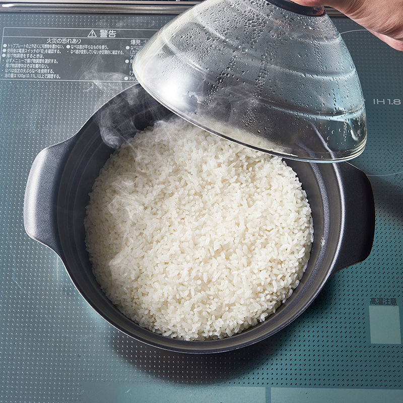 炊き上がる様子が見える、耐熱ガラス製のフタ。