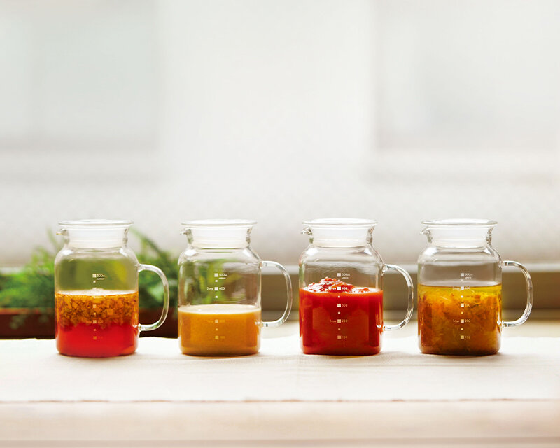 本体、フタ共に耐熱ガラス製なので、熱湯洗浄・食器洗い乾燥機OKでいつも清潔に保つことができます。フタをしたまま電子レンジOK。作ってそのまま保存、フタをしたまま注ぐこともできます。作りやすい目安メモリ付。