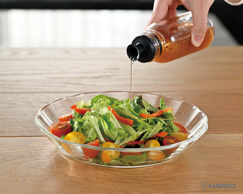 密封性が高いので材料を入れて、振ってドレッシングが作れます。耐熱ガラス製のボトルは食器洗い乾燥機・熱湯での洗浄ができます。収納しやすいスリムボトル形状です。