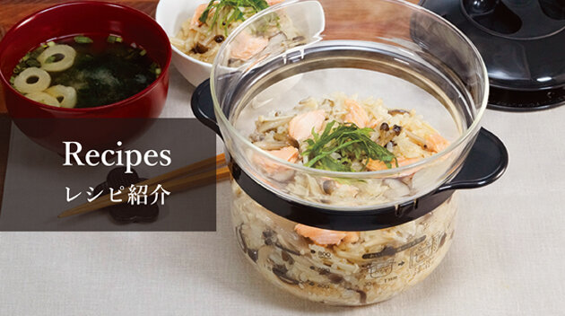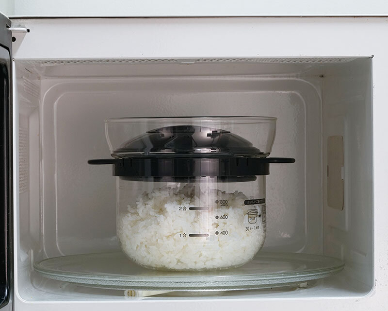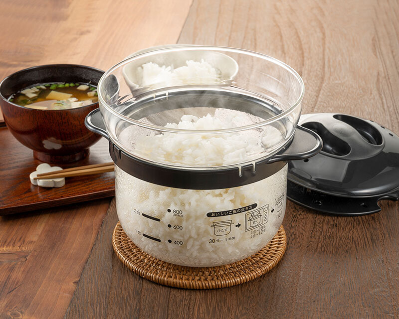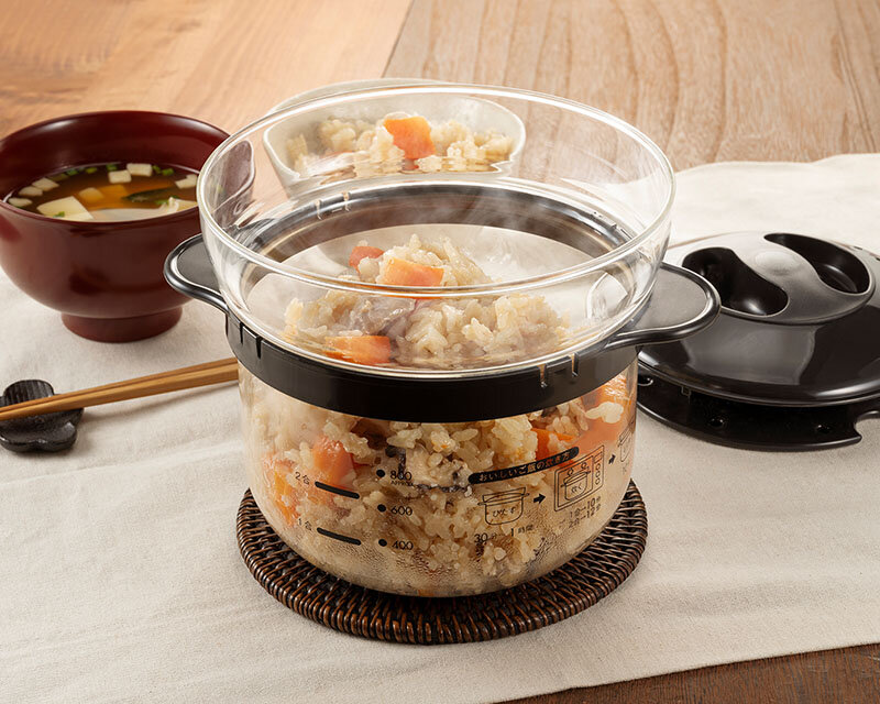 1~2 合のご飯が炊ける、電子レンジ用のご飯釜です。ご飯はもちろん、季節の炊き込みご飯もこれひとつで簡単調理できます。