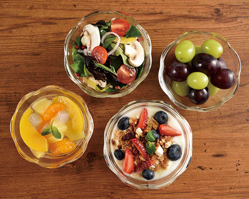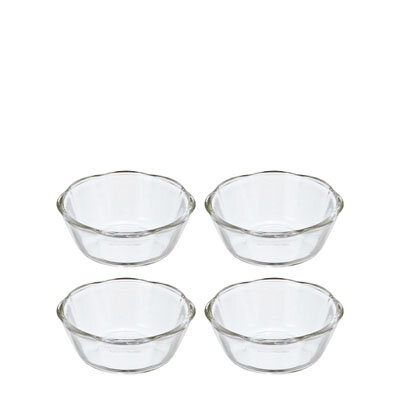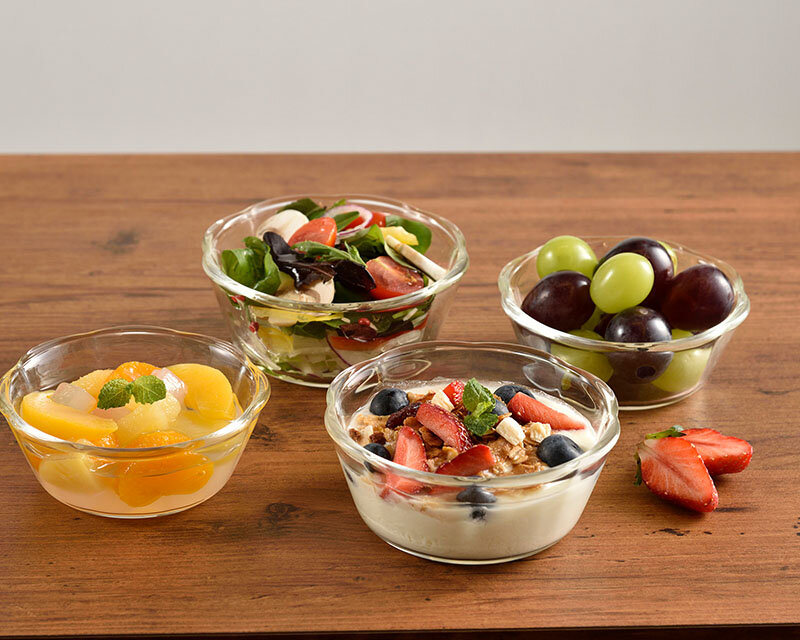 耐熱ガラス製のスイーツボウル。上から見るとお花の形状で小鉢としてもちょうどいい大きさ。電子レンジ・オーブン・食器洗い乾燥機OK。