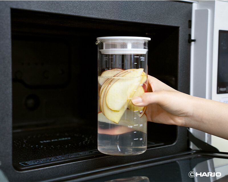 耐熱ガラス製でメモリ付き、フタをしたまま温め・注ぐことができます。