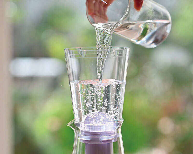 残留塩素やカルキ臭だけでなく、ミネラル分(カルシウムやマグネシウム)を軽減することにより、水を軟水化することができます。コーヒーやお茶本来の味をお愉しみいただけます。線の位置が700mLの目安線です。ろ過した水をコーヒーやお茶の抽出用に。