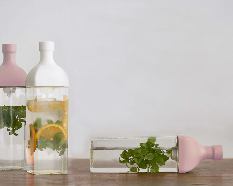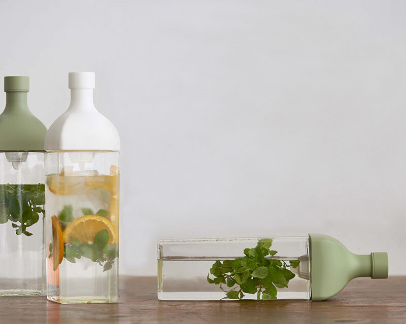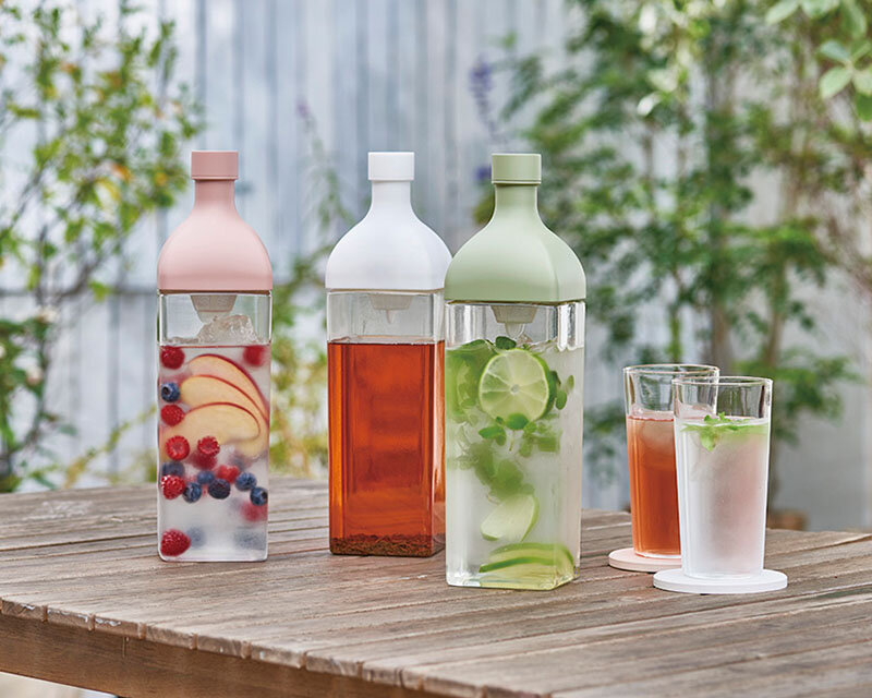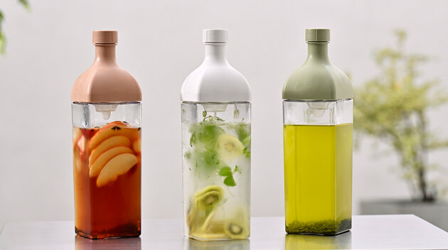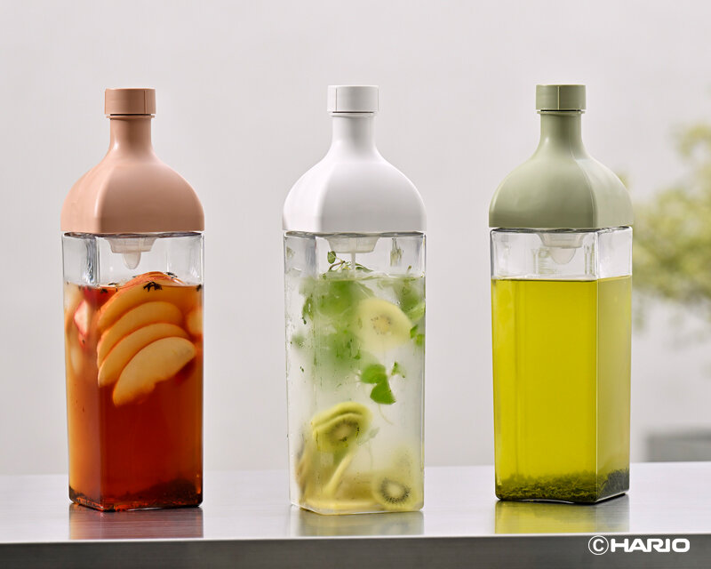本体ボトル部分がPCT樹脂の角型ボトルです。注ぎ口内側にフィルターが付いているので水出し茶を作ることもできます。注口部分にフィルターがセットされているのでそのまま注げます。1,200mlの大容量なので、水出し茶はもちろんフレーバーウォーターをたっぷり作って保存して置けます。冷蔵庫の棚に横置き保存ができます。冷蔵庫のドアポケットにも収納OK。