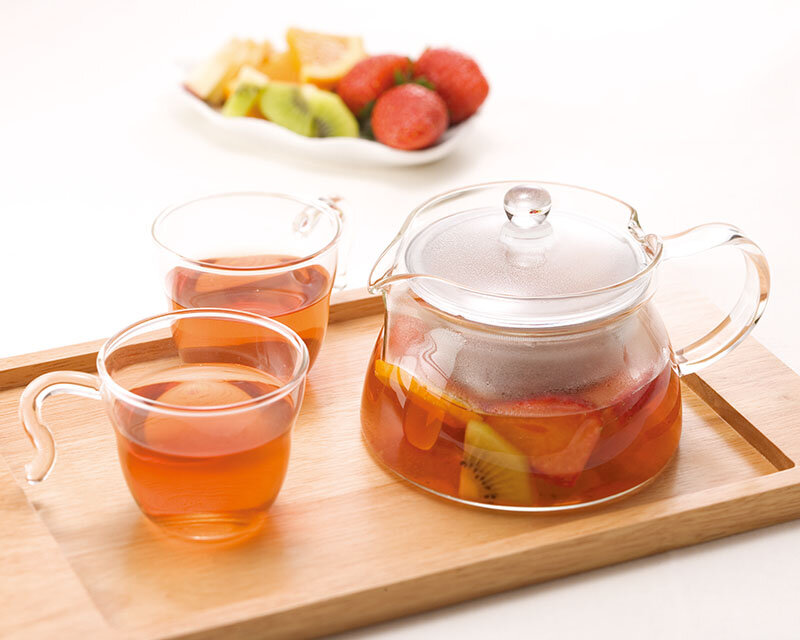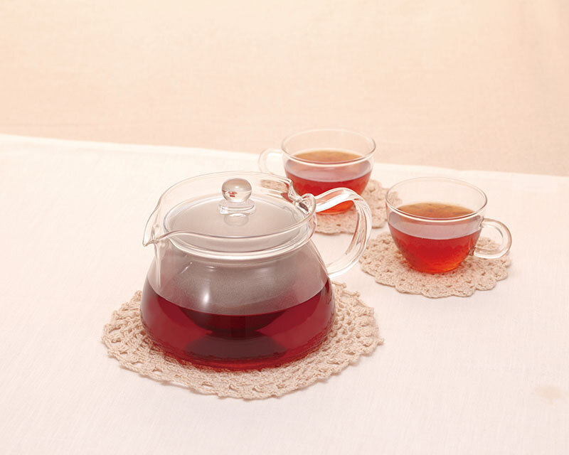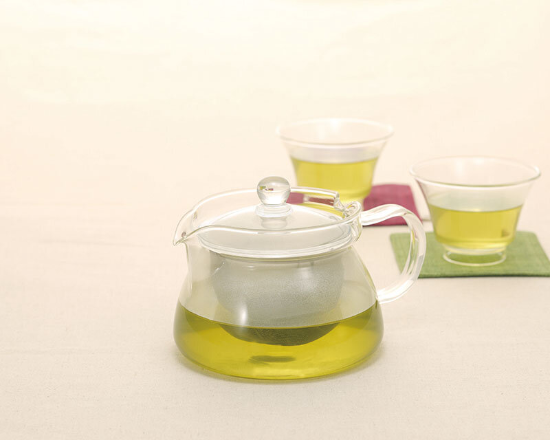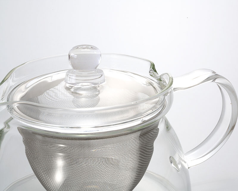 耐熱ガラス製の急須なのでお茶の色合いが目で愉しめます。お茶の葉が広がりやすい大きな茶こし付きです。フタのツマミは持ちやすい丸形状です。