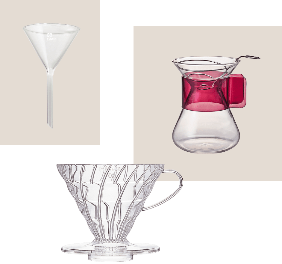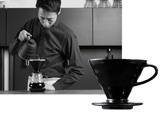 - 1921年、理化学品の製造・販売からスタートしたHARIO 。社内で身近にある三角ロートとろ紙を四つ折りにしてコーヒーを淹れたことが「V60」のはじまりです。円すい型(Y=X2の放物線)が、モノをろ過=濾すのに一番自然で良い形であることに気づき、1980年に一人用の円すい形ドリッパー「珈琲狂時代」を発売。この形を進化させ、ペーパーフィルターでネルドリップの味を手軽に再現できるようにと現在の「V60透過ドリッパー」が誕生しました。