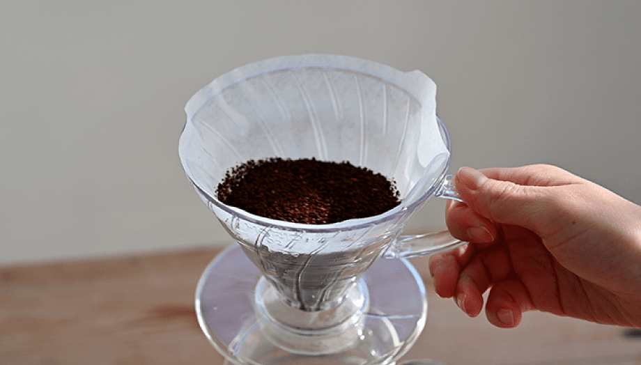 杯数分のコーヒー粉をドリッパーに入れ、軽くゆすって平らにしたあと、サーバーに乗せてください。