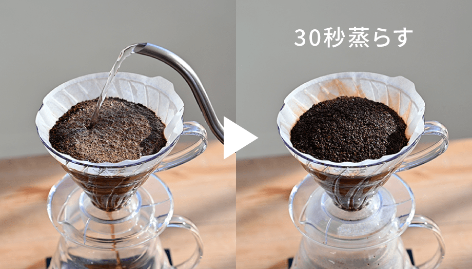 コーヒー粉量の2倍のお湯を粉の中心から全体がしめる程度にゆっくり注ぎ、注ぎ切ってから30秒蒸らしてください。