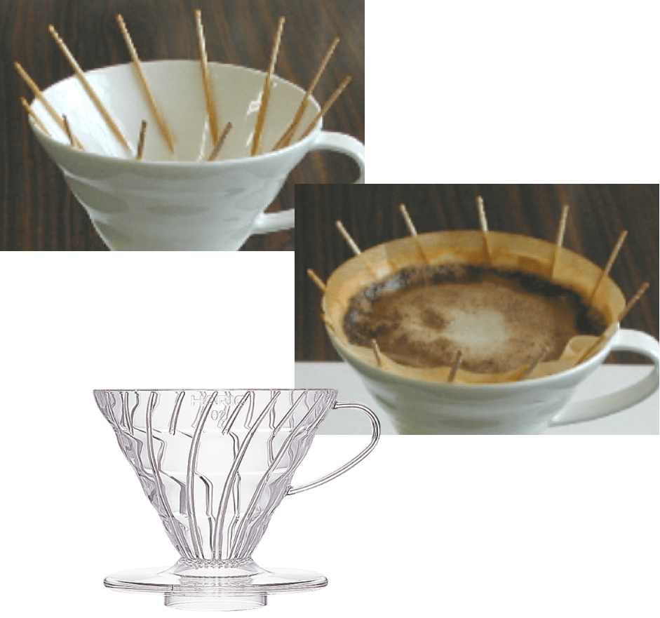 V60ドリッパーは円すい形。従来の扇形ドリッパーに比べ、深いコーヒー粉の層ができ、注がれたお湯が中心に向かって流れることによりコーヒー粉に長く触れ、成分をより多く抽出できるのが特長。